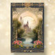 1 of 2 IMAGES THAT COORDINATE, ONE WITH CASTLE 5B, ONE WITHOUT 5A. Vintage Victorian Art Nouveau scrollwork, arched golden design is paired with a fantasy Castle on a lake with a gentle ethereal glow. The elegant border is in a muted dark dusty navy blue grey. The tranquil lake runs through a lovely garden with deep purple and lovely pink flowers that finish the scene. Softly enhanced by script handwriting ephemera that is layered over the crackle textured image. MSP0119