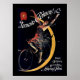 This is a digitally enhanced print of an antique Victorian era ca. 1894 French bicycle advertisement poster in the Art Nouveau style and features a woman riding a bicycle through stars and a crescent moon.