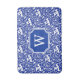 Digital reproduction of an Art Nouveau damask pattern bath mat with a striated, Ikat woven texture and a custom monogram - White on a deep cobalt blue background