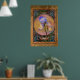 This unique poster is a print of an original painting by digital artist, Leslie Sigal Javorek, inspired by the colours, textures, graceful curves of 19th Century Theatre Posters by Art Nouveau Master, Alphonse Mucha. The focal point are a pair of purple blue Iris set inside of an elaborately cut metal (aged copper) faux 3d frame that reveals blue & green glazed enamel behind it & a wide outer border of tinted shale. See coordinating posters from this series.