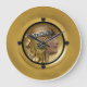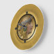 10.75” round acrylic gold wall clock with an image of a gold Art Nouveau medallion of a young woman wearing a diamond-studded headdress. Black border and shiny black orbs mark the 12, 3, 6, and 9 positions. See the entire Gemstones & Medallions Clock collection in the HOME section.