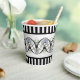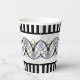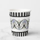 Bridging the transition from Art Nouveau to Art Deco, the original design on these paper cups, features blue-green opalescent Scallop Seashells, Celadon & pale pink Lilies, undulating silvery grey ropes intertwined in "Double Dutch" fashion through black Gothic archways, and black & white vertical stripes along top & bottom.