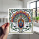This stunning ceramic tile features a vibrant Art Nouveau-inspired peacock design, showcasing its magnificent fanned tail feathers adorned with intricate floral patterns. The rich color palette of blues, oranges, pinks, and yellows pops against a clean white background, framed by elegant green foliage and geometric accents. Perfect for adding a touch of vintage charm and sophisticated elegance to any space, this tile tells a story of natural beauty and artistic craftsmanship. Its detailed illustration and unique aesthetic make it a captivating focal point for kitchens, bathrooms, or any decorative wall project.
