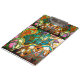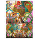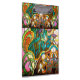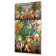 Features an art nouveau floral stained glass window design. In colours of gold, green blue and pink. Features white irises and purple flowers.