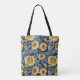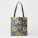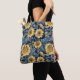 Do your shopping in style with this tote inspired by the Art Nouveau movement featuring stylised sunflowers on a navy blue background.