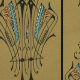 An artistic, art nouveau design by Christopher dresser. A mixture of arts and craft style , Victorian and art nouveau textile. Bold and elegant. In colours of black, gold, blue and orange.