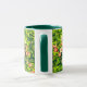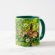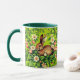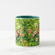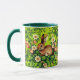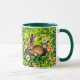 Mug in an Art Nouveau style illustration, inspired by the design style of William Morris, features a brown rabbit nestled among flowing vines, white daisies, and pink tulip-like flowers. The design emphasizes intricate botanical motifs, evocative of Morris's decorative arts.