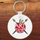 A keychain for art teachers featuring an illustration of a red apple with painted text "ART TEACHER" in white. Two brushes crossed behind the apple. One paintbrush with red and white paint, one with green.