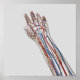 Medical illustration of arteries, veins and lymphatic system in hand and arm.