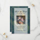 Save the Date with Photo! Celebrate your wedding in an artful and unique peacock theme with this beautiful wedding invitation and matching accessory set. Features stylish, rich and luxurious artwork of a peacock feather detail in colours of cobalt blue, teal and celadon light green. Background in dark aqua blue with an antique wash and swirly design. © 2010 www.CustomInvitesOnline.com