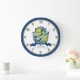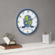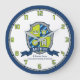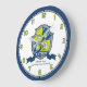 Knights style shield monogram letter A art name simple numbered wall clock perfect for a boys bedroom or playroom in shades of green, blue white and grey. Personalise with your child's own name and name meaning for a personalised touch to your child's bedroom or nursery, this example is for names with the letter A. Currently reads Arthur A brave bear. Legendary leader of knights. Ideal for a gift to a new baby boy, for a christening, baby naming or baby shower gift. Unique shield drawing, graphic art, name research, wording and design by Sarah Trett. www.sarahtrett.com for www.mylittleeden.com