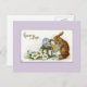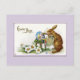 This artistic brown bunny is painting, flowers and yellow chicks, on a blue Easter Egg. There is paint dripping from the painter's palette and a bouquet of white lilies laying on the ground. Greeting: Easter Joys. Image of a Vintage Stecher Easter Postcard on a lovely lavender background.