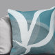 Modern throw pillow features an artistic abstract leaf design in a turquoise, grey and white colour palette. This abstract composition is built on combinations of organic shapes and lines, which are overlapped and interlaced to form an intricate abstract pattern. The white and grey design compliments the turquoise blue background.