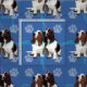 An artistic rendering of a pair of Basset hounds snuggling against a blue background with paw prints and tracks in grey, pink and blue.
