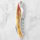 A wine corkscrew bottle opener featuring an artistic design in ochre and burn orange colours.