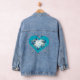 Elevate your wardrobe with this unique denim jacket showcasing a beautifully detailed heart and butterfly motif on a turquoise backdrop. The design blends whimsy and charm with classic denim, creating a standout piece that pairs effortlessly with jeans, dresses, or skirts. A perfect choice for those who love expressive and artistic fashion.