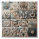 A vibrant display of handcrafted ceramic tiles features an array of geometric and floral patterns, blending shades of blue, beige, and earth tones.