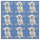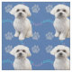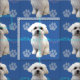 Cute artistic style Maltese dog on a blue background with paw prints and tracks in grey. pink and blue. The original photograph was modified to give it a painted appearance.
