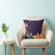 Modern floral throw pillow features a stylish designer botanical floral print in a peachy orange and green colour palette with yellow accents on a deep eggplant purple blue hue background. A layered design featuring golden lines and circular shapes with a stylish pink leafy background, all presented on a deep eggplant background. The layered elements create depth and perspective within the overall design.