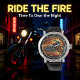 Vivid artwork of a motorcycle surrounded by lively orange flames, symbolising speed, freedom, and power. Bright colours and abstract elements emphasize its energetic and bold concept.
