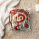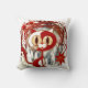 A whimsical Christmas pillow featuring a cute kitty on a background with Christmas wreath and festive red stars, wishing you a Merry Catmas.