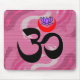 Product: yoga mousepads --- Design: unique om symbol with red crescent moon and purple lotus --- Background: pink abstract