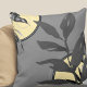 Modern throw pillow features an artistic abstract design in a dark grey and yellow colour palette. A stylish modern design features watercolor leaves and a geometric circle composition with an inquisitive hummingbird in the upper left hand corner highlighted with a light yellow colour block. This modern composition is built on combinations of repeated leaves and circles, which are overlapped and interlaced to form an intricate design. The yellow and grey accents are layered and interspersed to give perspective and depth to the overall design.