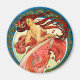 1898 Art Nouveau lithograph poster by Czech artist, Alphonse Mucha (1860-1939). Beautiful woman in a red dress, flowers in her long, flowing, bright red hair, her back arched, looking over bared shoulders, standing on her toes.