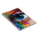 This notebook has an artsy blue eye on it.