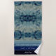 Beautiful, artsy, navy blue, green, yellowish brown and sand colour, coastal theme custom text Beach Towel, featuring octopus, whale, ship, lighthouse, seashells illustration on watercolor backgrounds, and various blue stripes at the bottom, designed by theLakeIsland.