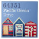 Coastal style, artsy, custom house number, featuring watercolor, blue, white and red Beach huts illustration on lighter blue background, designed by PiccoGrande.