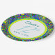 Artsy fun bold blue, yellow, green, red, teal, multicolor, popular pattern paper plate of different shapes and sizes, featuring easily adjustable custom text over white background.