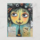 Digital scrapbooking and art journalling inspiration. Bits and pieces of paper glued onto a blue distressed background. Top layer: a whimsical girl with wild black hair and big eyes.