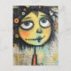 A whimsical character with exaggerated large eyes and a stitched mouth is the focal point against a background filled with script-like text and abstract elements. The character's hair is adorned with various colourful shapes and objects, adding a playful and eccentric vibe to the piece.