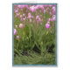 Colour photo of pink tulips and grass. 5"x7" (portrait). Digitally altered. Blue border.