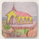 A watercolor pencil sketch and painting of the Alto Vista Chapel in Aruba with Caribbean Sea and various cacti, rocks and thorny shrubs.