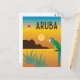 Aruba bright colourful illustration with a rocky beach, sun, aloe plants, a brown throated parakeet and the four pointed star from the flag of Aruba. The name is in a vintage deco font. Celebrate memories of your island vacation travel or Caribbean cruise.