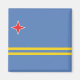 Aruba's national flag was adopted on March 18, 1976. The design consists of a field of light blue (called "Larkspur"), two narrow parallel horizontal yellow ("Bunting Yellow") stripes in the bottom half, and a four-pointed white-fimbriated red ("Union Flag red") star in the canton. The flag was designed in part by vexillologist Whitney Smith.