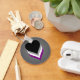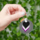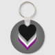Basic Button Keychain with hearts design in colours of asexuality; pink, yellow and blue stripes pride flag, rainbow love design, on grey background