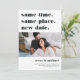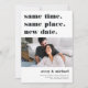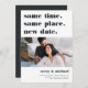 Need to postpone or reschedule your wedding? Let guests know with these modern and lighthearted cards in white with rich off-black lettering. Funny and clever typography-based design features "same time, same place, new date" at the top with your new wedding date and details beneath. Customise with a photo, and add additional details to the back.