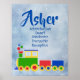 Asher Name Poster on blue watercolor background, with a colourful train and customisable text. The adjectives start with each letter of the chosen name. You can customise the adjectives for this name or choose another name and corresponding adjectives. Or you can contact me to customise a poster with your name of choice. NOTE: when customising, the top name is written twice (once in blue and once with a lighter "shadow") to make it stand out.