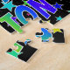 This fun and lively birthday-themed jigsaw puzzle design has the message "HAPPY BIRTHDAY, ASHTON" with the characters having a colourful rainbow spectrum inspired gradient pattern, in addition to an exciting star shapes background pattern. A vibrant puzzle like this might be used to send birthday wishes to somebody named Ashton. [~Z0000468]