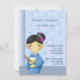 A cute little Asian girl sitting with a rice bowl against a background of blue fans. A sweet design for a little miss.