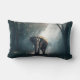 A lumbar pillow with a photograph of an Asian elephant with rounded ears standing in a forest clearing looking towards the viewer with sunlight streaming down through the canopy of trees.