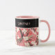 This lovely Asian-inspired monogrammed mug features a Japanese style floral print of dusty pink, light peach, garnet red, creamy white, and brown. Your monogram name appears in a stylish typeface in pink against a color block of black at the top on both sides of the cup. This mug has a pink handle and interior.