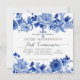 "Asian Influence Blue White Floral First Communion Invitation." Features a hand painted acrylic watercolor design with a delicately painted cross, chinoiserie flowers and leaf border top and bottom that slightly overlays the white, inner edge to edge rectangle (you can add a background colour that will show through the top and bottom should you wish). Artwork was created by artist, Audrey Jeanne Roberts. Copyright. Hand painted watercolor Blue Asian Influence Floral Chinoiserie design has a complete collection available here (copy and paste link into browser): https://bit.ly/2DS0gN6