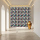 Chic and culturally rich, this chinoiserie-style tile showcases a majestic Asian pagoda with intricate blue porcelain details and lush floral elements.