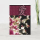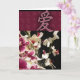 White orchid against a black background with purple and pink background and Chinese Love symbol.