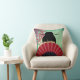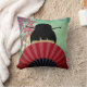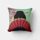 Throw pillow is shown with a coy Asian lady hiding behind a fan along with a single orchid tucked in for fun.