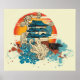 Asian Temple Pagoda custom print poster, featuring an Asian temple pagoda, scrolls, flowers and swirls and a large sun in the background. Asia Style Landscape and Temples with Sun Scrolls and Flourishes.
